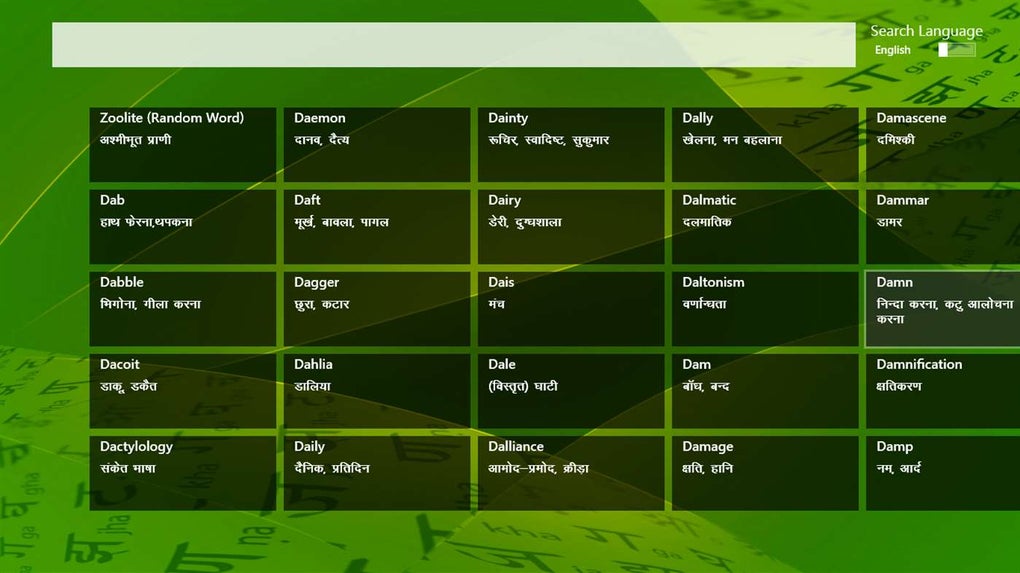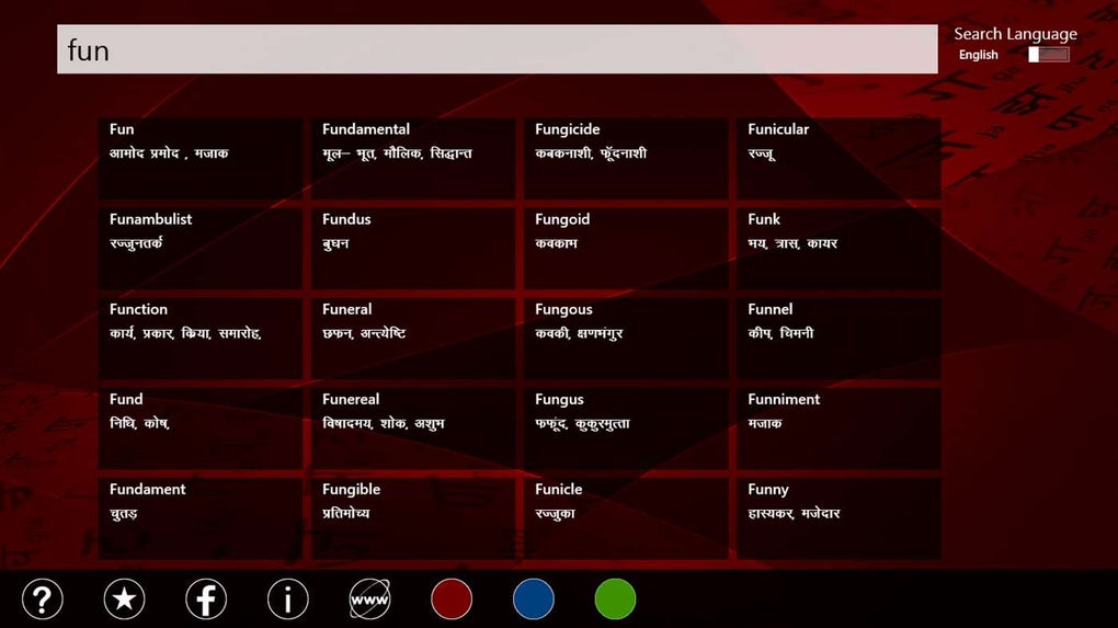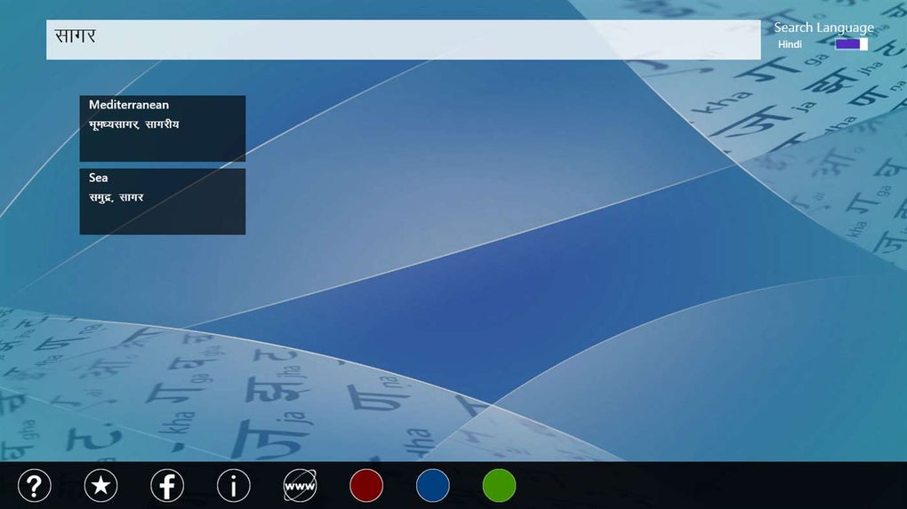 Advance Hindi Dictionary puede ser un excelente recurso si necesita servicios de traducción confiables (como si está planeando unas vacaciones en el extranjero). Este paquete de software está equipado con mosaicos interactivos en vivo para un acceso simplificado a palabras relacionadas y está vinculado con todos los motores de búsqueda principales. A diferencia de programas similares, este diccionario puede usarse incluso cuando no hay conexión a Internet disponible.